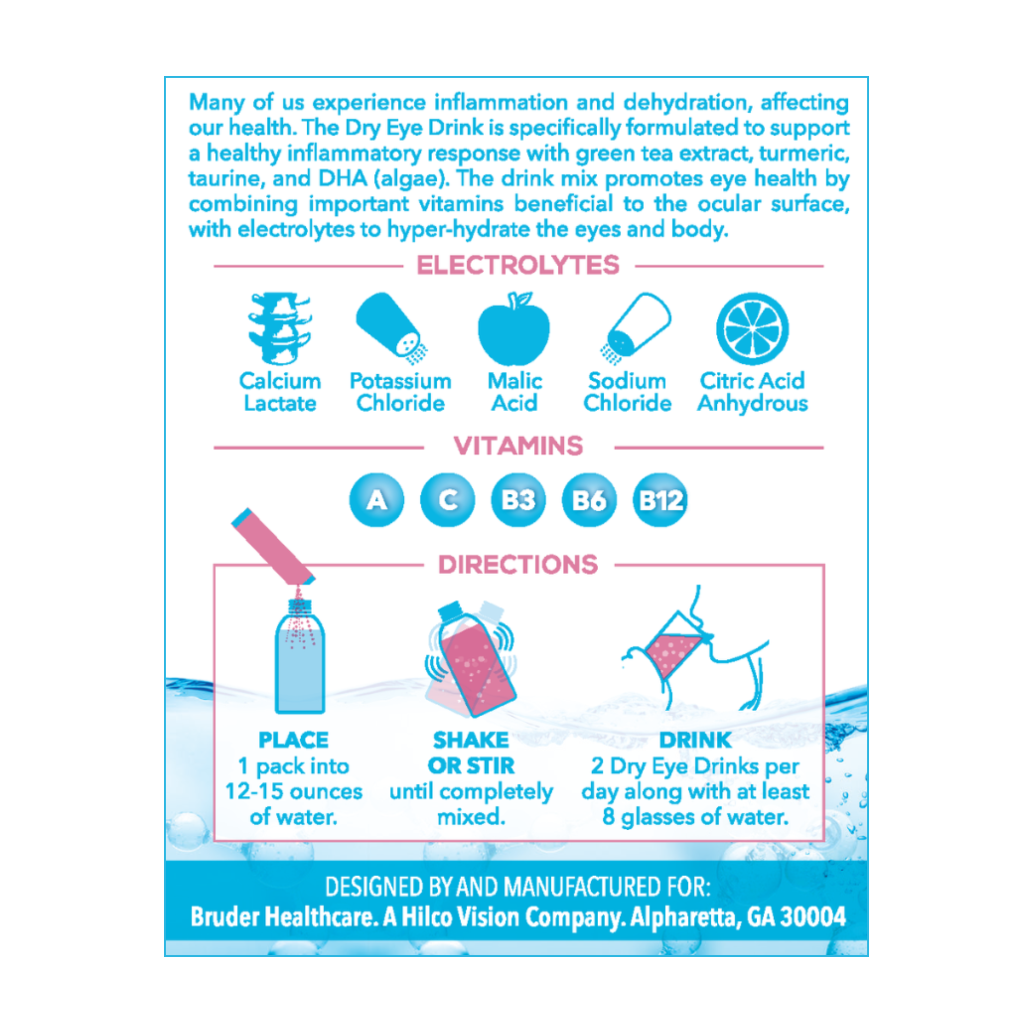 - Crafted by eye doctors, The Dry Eye Drink™ includes ingredients to support a healthy inflammatory response, vitamins to enhance eye health, and electrolytes to hyper-hydrate and help absorb these nutrients.