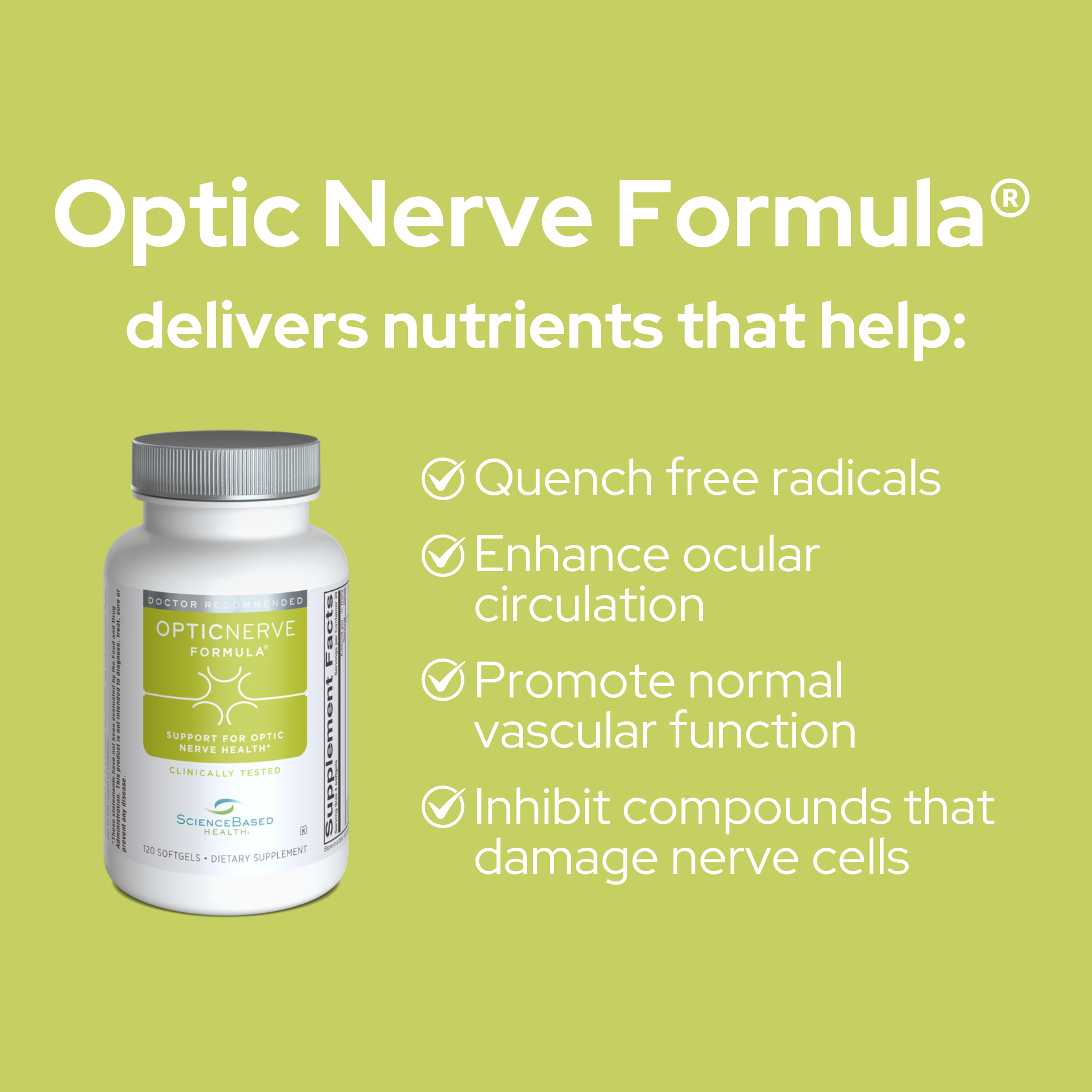 La fórmula especializada ayuda a mantener la salud del nervio óptico con una mezcla de ingredientes que actúan para aumentar los niveles de antioxidantes, ayudar a mantener la función nerviosa saludable y ayudar a mantener la circulación ocular normal.