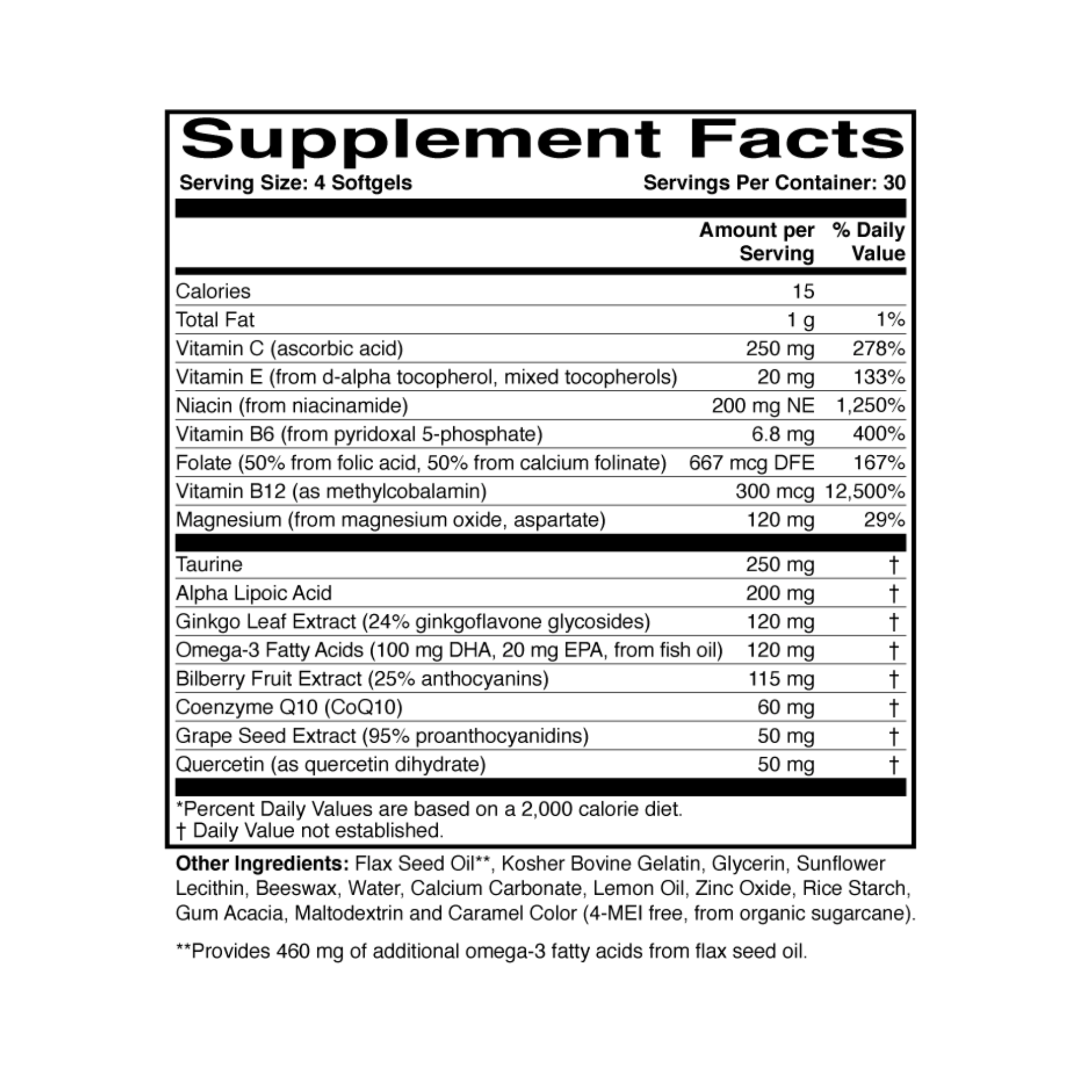 Nota: Contiene Ginkgo biloba, que puede afectar la agregación plaquetaria. Si está tomando medicamentos anticoagulantes o antiplaquetarios, consulte a su médico. Las mujeres embarazadas o en período de lactancia o las personas con afecciones médicas conocidas deben consultar a su médico antes de usar este producto.