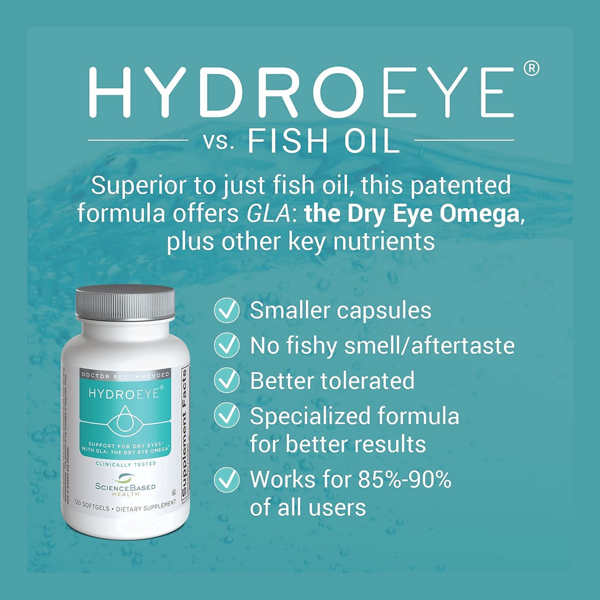 HydroEye® is a doctor-recommended nutritional supplement for dry eye relief that works from the inside out to provide continuous support and comfort for dry, itchy eyes.